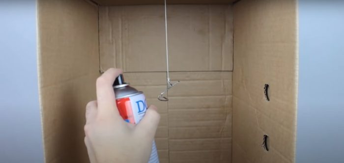 С помощью веревки, палочки и коробки можно покрасить мелкие детали без окрашивания окружающих предметов. Для этого деталь нужно закрепить на нитке. Затем нужно поставить коробку на бок, а в верхней стороне проделать небольшое отверстие. В него заводится нитка, после чего привязывается на палочку, теперь она будет зафиксирована. Деталь в подвешенном состоянии очень хорошо прокрашивается и сразу со всех сторон, а брызги от флакончика краски не вылетают за пределы коробки.