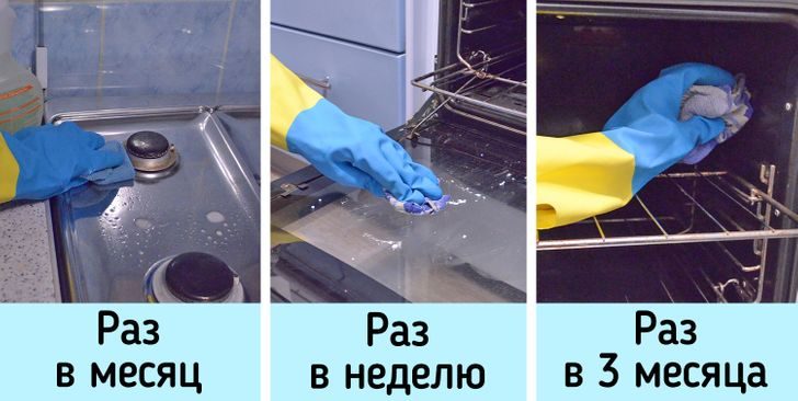Чтобы избежать этих неприятных последствий, верхнюю поверхность прибора нужно чистить довольно часто. Четких критериев нет: можно удалять загрязнения с варочной поверхности сразу после готовки, можно делать это реже. Главное, нужно проводить чистку хотя бы раз в месяц. Также следует чистить и решетки газовой плиты и конфорки. Духовку нужно очищать от остатков пищи и нагара раз в 3 месяца, а ее дверцу — раз в неделю.