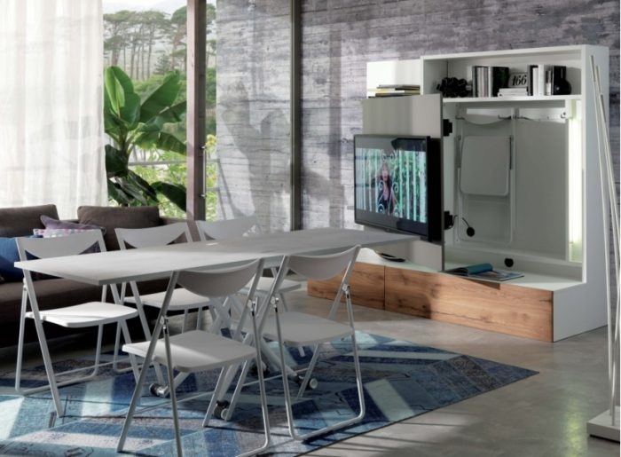 На первый взгляд эта мебель может показаться обычной. Но в ней много секретов. Например, ниша для телевизора одновременно выполняет две функции: первая — основная, а вторая — место для хранения складных стульев для обеденной зоны. Под телевизором располагается небольшая сдвигаемая панель, в которую прячется довольно вместительный журнальный столик на регулируемых ножках. При желании этот столик можно меньше чем за минуту трансформировать в полноценный обеденный стол: подняв его повыше и разложив столешницу в два совмещающихся блока.