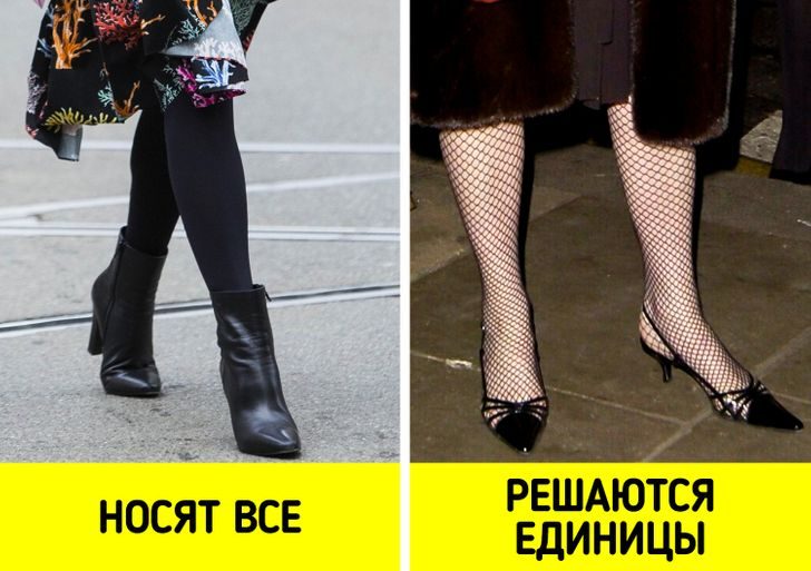 Такая небольшая деталь, как цветные носки или колготки, может мгновенно преобразить и оживить весь ваш образ. Мы привыкли носить черные или бежевые колготки, и порой это действительно хороший выбор. Но если хочется добавить своему облику игривости и пикантности, то яркие носки в сочетании с ботинками или фантазийные ажурные колготки придут вам на помощь. Оттенки могут использоваться самые разные — от бордового до изумрудно-зеленого. Все зависит только от вашего вкуса и настроения. Так, цветные колготки или носки — частый атрибут в гардеробе итальянок, а француженки вообще редко носят колготки телесного цвета.
