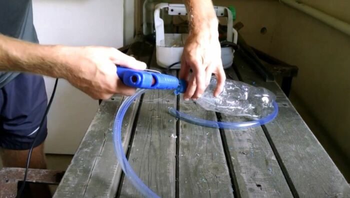 В днище пластиковой бутылки нужно проделать такое отверстие, чтобы в него пролез шланг. Далее сам шланг нужно разрезать на две равные половины и при помощи термоклея зафиксировать их на бутылке. Соответственно, одна половинка крепится к проделанному в нижней части отверстию, а вторая насаживается на горлышко. Устройство готово!