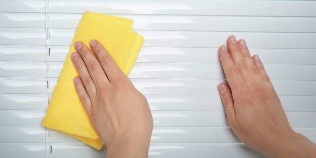 Постелите под окно клеёнку, чтобы защитить пол. Сначала закройте жалюзи и удалите пыль тряпкой или пылесосом. Несколько раз поменяйте положение ламелей и повторите процедуру.