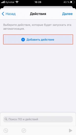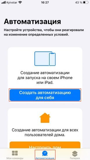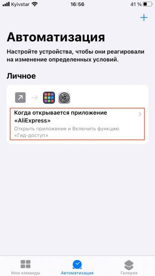 Откройте приложение «Команды», перейдите на вкладку «Автоматизация» и тапните «Создать автоматизацию для себя». Если у вас уже есть добавленные сценарии, просто нажмите кнопку «плюс» вверху экрана. Затем выберите вариант «Приложение».