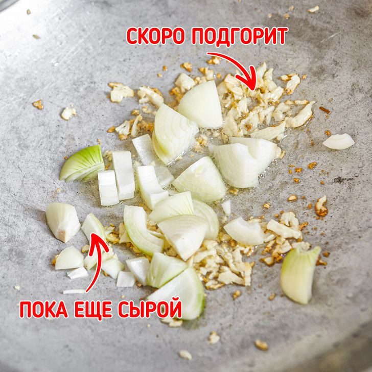 Для того чтобы прожарка лука и чеснока была одинаковой, следует нарезать чеснок крупными дольками. Либо, если рецепт подразумевает натертый или мелко нарубленный чеснок, помнить, что он обжарится за 10 секунд. А значит, лучше заранее подготовить другие ингредиенты, чтобы немедленно добавить их. Можно также покрошить позже сам чеснок.