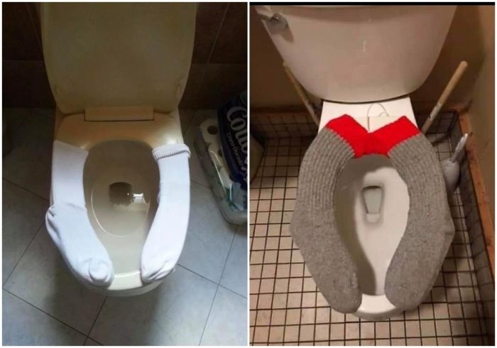 «Дёшево и сердито» — так можно сказать о данном лайфхаке, где носки «призваны» утеплить сиденье унитаза, тем самым обеспечив комфорт не только хозяевам квартиры, а и гостям.
