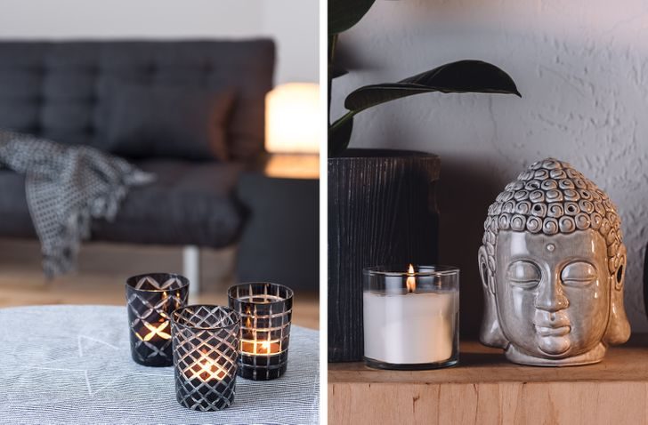 Свечи помогут создать более уютную атмосферу и акцентное освещение, а также подсветить некоторые уголки вашей квартиры. К тому же зажечь ароматическую свечу после тяжелого рабочего дня — это роскошь, доступная каждому. Сегодня в парфюмерных магазинах есть огромный выбор свечей с потрясающими, тонкими ароматами на любой вкус. Такая ароматерапия не станет ударом по вашему бюджету, но принесет массу положительных эмоций. Кстати, одна хитрость от дизайнеров: ставьте свечи в стеклянные подсвечники. Они красиво отражают свет и защитят вашу мебель от воска.