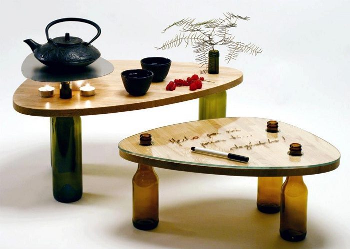Симпатичный столик ножки которого выполнены из винных бутылок — креативное решение.