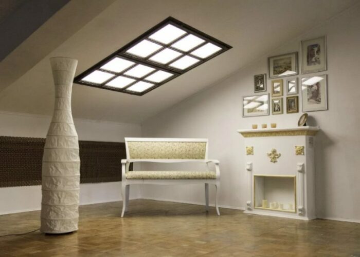 Мансардное окно — это крайне романтичный и хара́ктерный элемент интерьера. Некоторые владельцы загородных домов, имея спальню на втором этаже, мечтают «прорубить окно к звёздам». Если, помимо мечтаний, есть ещё и средства для осуществления, идея хороша. Но есть и подводные камни. Во-первых, дополнительное окно — это также дополнительный холод зимой и зной летом. Во-вторых, во время дождя придётся едва ли не кричать, чтобы расслышать друг друга под стук капель. В-третьих, если засыпать под звёздным небом очень романтично, то быть разбуженным назойливым солнечным лучом, бьющим прямо в глаза, уже не слишком атмосферно. Чтобы минимизировать описанные дискомфортные моменты, нужно быть готовым к ощутимым финансовым вложениям: качественный металлопрофиль, автоматическая система жалюзи снаружи (на случай сильного дождя или метели, а также защита от прямых солнечных лучей). Не лучше ли сымитировать мансардное окно при помощи современных фальш-конструкций?