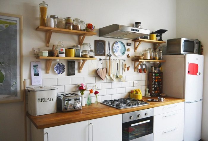 Светлые просторные кухни, пустые столешницы, отсутствие верхних шкафчиков – все это выглядит очень красиво, стильно и аккуратно…но только на картинках. В жизни так не бывает, особенно если вы живете в хрущевке, где площадь кухни составляет 5-6 кв.м. Именно поэтому еще на этапе ремонта стоит продумать, где вы будете хранить посуду, кухонные принадлежности, мелкую бытовую технику, столовые приборы, моющие средства и прочие вещи, которые неизменно присутствуют на кухне. Конечно, заставлять всю площадь комнаты мебелью – это не решение проблемы. Лучше всего предусмотреть шкафчики со стеклянными дверцами, несколько открытых полок, на которых будут стоять емкости для сыпучих и специи, угловой стеллаж для посуды или миксера, кофеварки, блендера.