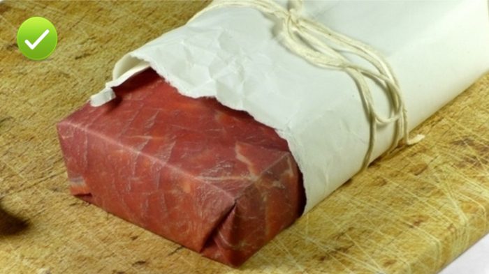 При покупке колбасных изделий типа докторской колбасы, различных мясных рулетов и т.п. желательно либо сразу освободить продукт от обёртки (например, рулеты обычно завёрнуты в сетку + несколько слоёв полимерной оболочки), либо, по меньшей мере, класть в холодильник, не укутывая в целлофан, поскольку во влажной среде, да ещё и без проветривания уже на 2-3 день начнут размножаться бактерии. Как правило, это легко заметить ещё до появления неприятного запаха: влага на срезе докторской или поверхности мясного рулета становится липкой, а на сочной полендвице начинает подозрительно переливаться цветами радуги. Оптимальный вариант — плотная бумага для пищевых продуктов или даже кусочек бумажного полотенца. НЕ зря же в СССР колбасу хранили строго в газете!