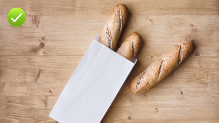Хранение хлеба в целлофане приводит к выделению избыточного конденсата и появлению плесени. Так больше трех дней хлеб не продержится. В домашних условиях можно применять холстину или отрез льняного полотна. Просто заворачиваем в него хлеб, тогда его свежесть удастся сохранить на неделю. Если через это время продукт из группы хлебобулочных изделий и зачерствеет, вкуса и полезных компонентов он не растеряет. Второй отличный вариант — пакет из бумаги — оптимальный вариант для любителей продукции с хрустящей корочкой. В крайнем случае допускается применение плотной бумаги, но без следов краски.