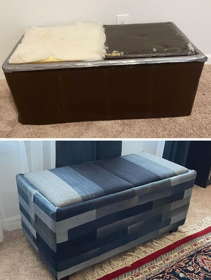 «Своими старыми джинсами мы обили очень потрепанный пуф для хранения»