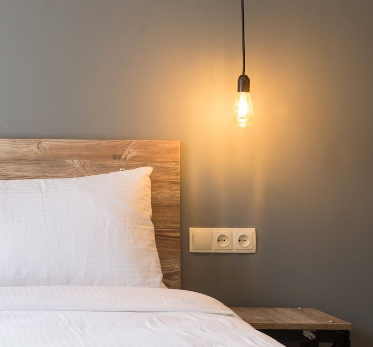 Прикроватные лампочки кажутся слишком скучным и привычным решением. Но у модных подвесных конструкций есть свои минусы. Если сэкономить на шнуре — он будет выглядеть неряшливо. Сам по себе провод под весом патрона не распрямится. К тому же при неправильном размещении об эту конструкцию будешь все время биться головой. Да и маленькие дети так и норовят повиснуть на этой красоте.