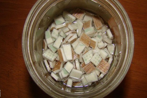 Мелко раскрошите, пересыпьте в банку и залейте ацетоном, так чтобы кусочки погрузились полностью в растворителе.