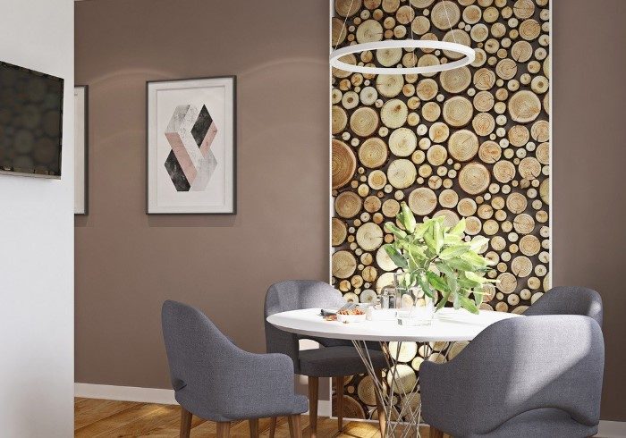 Деревянная стена из бревенчатого сруба — еще один стильный вариант. Чем больше на брусках сучков, трещин и неровностей, тем лучше. Изделия закроют все дефекты стен и станут изюминкой интерьера. А еще сэкономят время и усилия на обработку древесины.