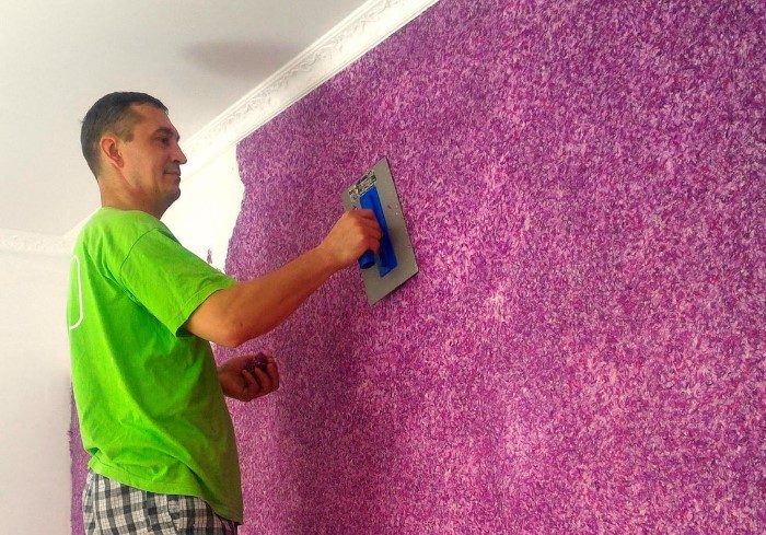 Дорогостоящий, но действенный способ покрыть стены без предварительного выравнивания штукатуркой или шпаклевкой. Жидкие обои создают равномерное шелковистое покрытие. Наносятся кельмой, оптимальная толщина слоя — 3 мм. Средство замаскирует сколы в стенах и мелкие дефекты.