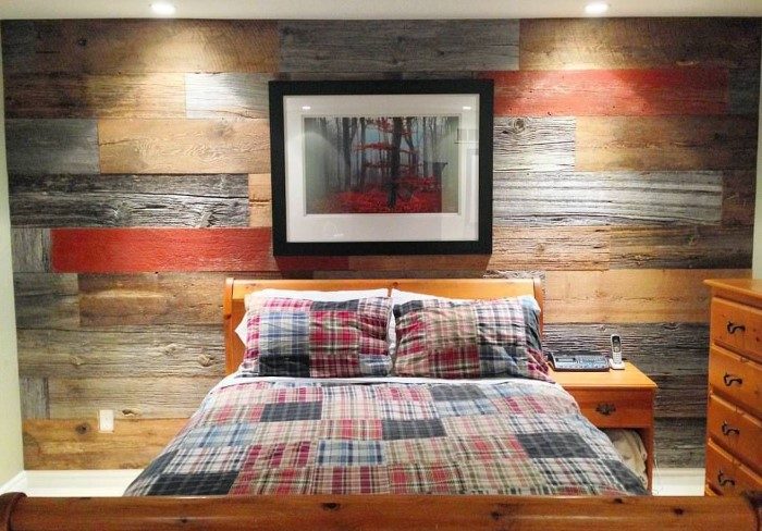 Используйте старые доски по аналогии с ламинатом. Украсьте одну стену побитой временем древесной со сколами и выцветшей краской. Располагать доски по всему периметру не нужно, иначе вместо оригинального декора получится перебор. Предварительно покройте изделия матовым лаком, чтобы на древесине не скапливалась пыль. Еще одно преимущество каркасной обшивки — возможность скрыть провода в комнате без трудоемкого штробления стен.