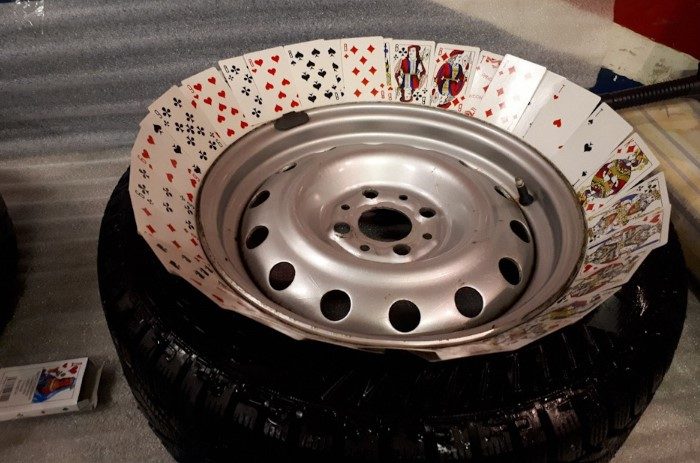 Чтобы защитить резину на машине при окрашивании дисков, на нее клеят малярный скотч или старые газеты. Но есть и другой вариант — игральная колода. Плотные карты предотвратят попадания краски в неположенные места. Расположите их по контуру диска, не оставляя просветов, и прочно закрепите. Можно приступать к окрашиванию. Для этого также подойдут и рекламные буклеты, если их скопилось слишком много.