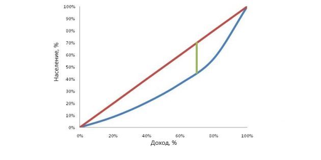 Красной линией обозначено равное распределение доходов, синей — приближённое к реальности. Разница между ними — это и есть коэффициент Джини