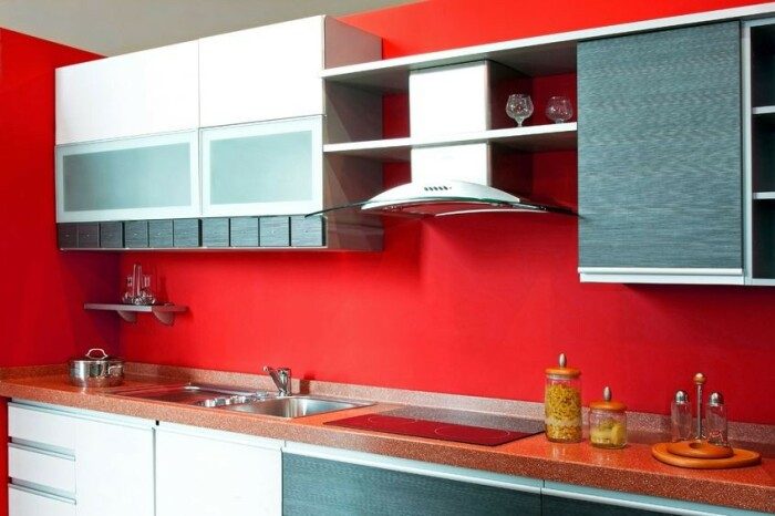 Учитывайте тот факт, что чем лучше моется краска, тем меньше шансов, что она будет матовой. В паре с таким фартуком будет плохо смотреться глянцевый гарнитур, так как получится блестящий и сияющий интерьер. Лучше заказать кухню с матовыми фасадами или отказаться от моющейся краски в пользу стеклянного фартука.
