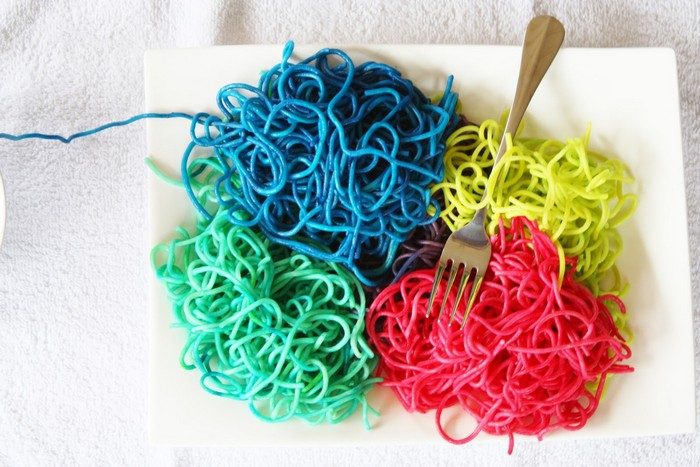 Или же можно пойти по ленивому пути. Макароны разделить на несколько порций, каждую положить в отдельную глубокую тарелку и добавить разбавленный краситель прямо в посуду. Не забудьте хорошо и тщательно перемешать. Правда, более яркие и насыщенные цвета получаются именно после вымачивания в пакете с красителем.