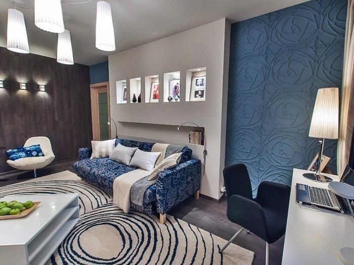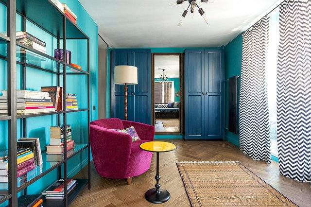 Справедливо считается, что светлые оттенки визуально увеличивают пространство, а темные, наоборот, уменьшают. В связи с этим российские квартиры часто оформляются в белых, бежевых тонах, а в качестве основного стиля выбирают скандинавский. Однако в последнее время дизайнеры все чаще адаптируют к небольшим хрущевкам насыщенные глубокие тона, которые сейчас в тренде: изумрудный, бордовый, бирюзовый и другие. Чтобы не делать комнаты визуально меньше, они используются в качестве акцентов: например, можно встретить светлые интерьеры с оранжевым креслом или диваном, белые комнаты с одной красной стеной. Впрочем, можно рискнуть и использовать яркие цвета для оформления всей комнаты, как на фото: голубые стены, синие шкафы, малиновое кресло, желтый кофейный столик. Эти цвета не так сильно давят за счет зеркала, которое отражает свет, и большого окна – в паре они способствуют зрительному увеличению комнаты.