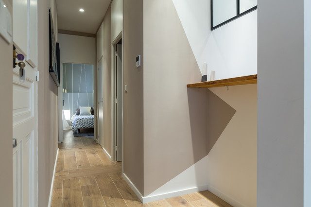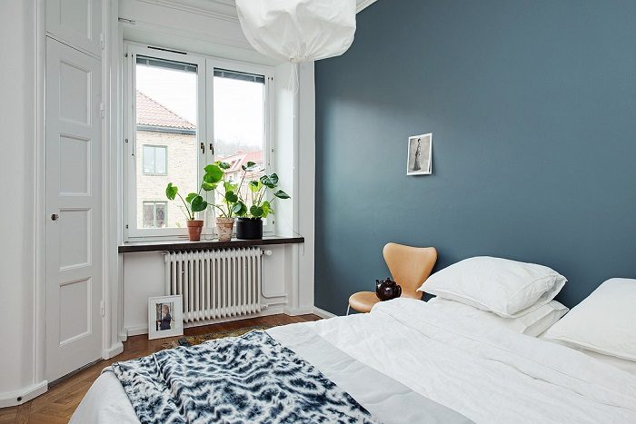 Если комната узкая или квадратная и ваша цель – исправить неправильную геометрию, обратитесь к темным стенам. В сочетании со светлым потолком и полом, они привнесут в помещение необходимый баланс. Так, узкая комната будет визуально казаться шире, а квадратная станет выглядеть более гармонично, не как коробка. Еще один способ сделать пространство длиннее – покрасить дальнюю от входа стену в тот же цвет, что и потолок, поставить светлый шкаф на фоне темной стены или задрапировать часть поверхности светлыми шторами.