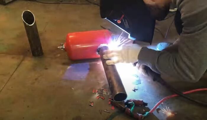 Далее из двух труб необходимо соорудить дымоход. Делается он при помощи сварки из двух фрагментов труб, которые срезаются под углом 45 градусов. Собранный дымоход в последствии приваривается к верхнему отверстию. К нижнему отверстию приваривается прямой фрагмент трубы, который будет использоваться для подачи воздуха.