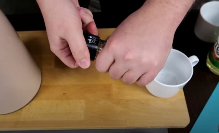 Для открытия мельницы нам понадобится полотенце, небольшая чистая емкость, кипяток, а также пара крепких рук. Итак, сначала наливаем кипяток в емкость, после чего сразу же опускаем в него пластиковую мельницу и держим в таком положении пару-тройку минут. После этого извлекаем мельницу, оборачиваем ее полотенцем и уверенным движением двух рук тянем конструкцию в разные стороны. Немного усилия и мельница разобрана! Можно повторно заправить после просушки. Для сборки достаточно поставить крышку-резчик на горлышко банки и хорошенько надавить.