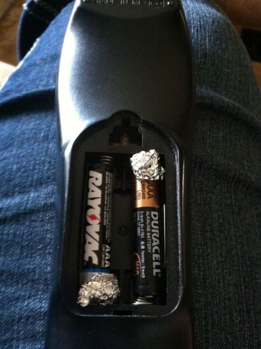 Фольга улучшит проводимость электричества батареек. В случае, если большие батарейки АА закончились, можно с легкостью заменить их меньшим форматом — ААА. Стоит просто смотать небольшие комочки фольги и использовать их в качестве проводника электричества.