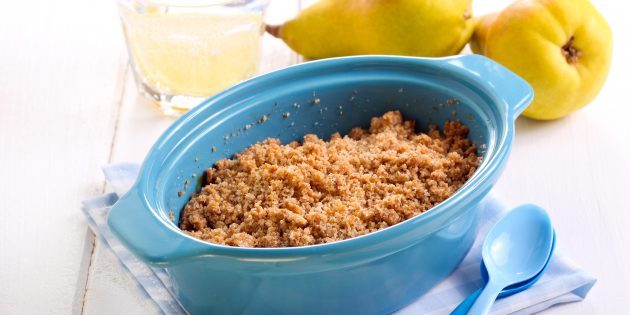 Крошку выложите поверх фруктов, запекайте блюдо при 200 °C, пока не приготовится тесто. Подавайте крамбл тёплым, можно добавить мороженое.