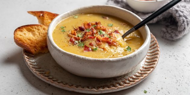 Приготовление супа обычно затягивается из-за необходимости отварить мясо и получить бульон. Но есть варианты, где эта проблема решена. Если нужно ускорить процесс, нагревайте воду не на плите, а в электрическом чайнике и переливайте её в кастрюлю.4. Суп с копчёностями и чечевицей