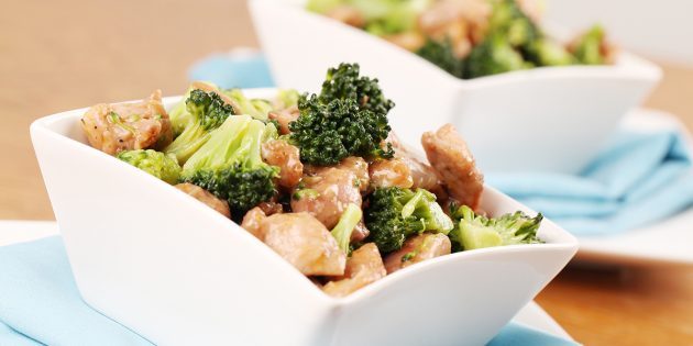Небольшие кусочки курицы обжарьте на смазанной маслом сковороде до золотистой корочки, добавьте нарезанные кубиками ананасы и соцветия брокколи. Не забывая помешивать, доведите блюдо до готовности.