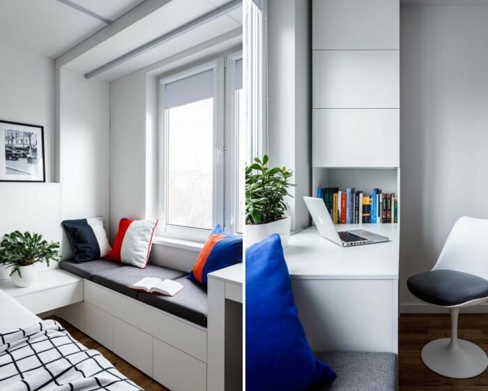 Большинству из нас нужен хотя бы небольшой рабочий стол, и подоконник станет отличной альтернативой. Его можно продлить вдоль всей стены или ограничиться одним окном, если нужен компактный домашний офис. Такое решение высвобождает место в комнате и делает ее просторнее благодаря тому, что не придется ставить стол в помещении.