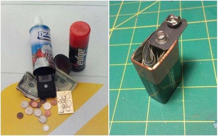 Как правило, привычные предмета обихода, находящиеся на виду, в самую последнюю очередь попадают под подозрение и вызывают к себе повышенный интерес со стороны воришек. По этой причине, предприимчивые владельцы способны превратить обычную батарейку, баллончик от дезодоранта, пены для бритья или сливок в надежный тайник для денег/легких предметов.