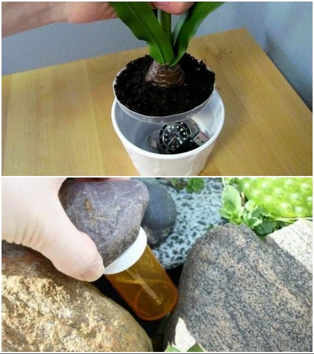 Несмотря на то, что комнатным цветам частенько приходится страдать от вредоносных воров, под ними все также устраивают тайники. Хотя для этих целей можно использовать не только кашпо или цветочные горшки, но и поленья, если в доме есть камин или хотя бы оформлен уголок в деревенском стиле. Когда же имеется двор или балкон/лоджия, на котором устраивают оранжереи и миниатюрные альпийские горки, то можно использовать даже камни, светильники и садовые фигурки.