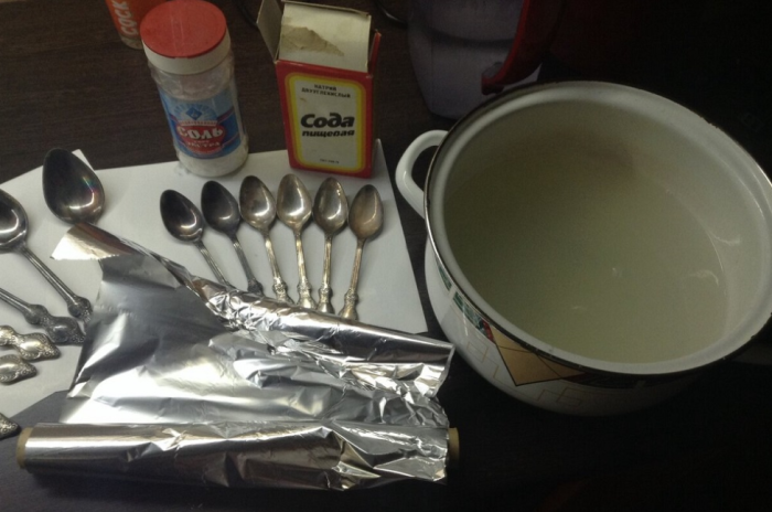Мероприятие по очистке столовых приборов от темного налета начинается с банального действия – кипячения воды. В горячую воду добавляется сода и соль (по столовой ложке) и размешивается. В этот раствор кладется фольга. Матовая ее сторона должна быть сверху. Поверх фольги выкладываются ложки и вилки. Дальше остается только наблюдать. Приборы приобретают свой первоначальный внешний вид прямо на глазах. Происходит такая вот обычная магия.