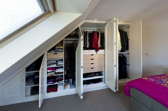 Мансардный этаж и кровать, расположенная под скатом крыши – это тема для отдельной статьи. Расскажем лишь о нескольких удачных вариантах. Если глубины будет достаточно, можно будет обустроить в образовавшейся нише гардеробную или установить небольшой стеллаж для хранения постельного белья, полотенец.