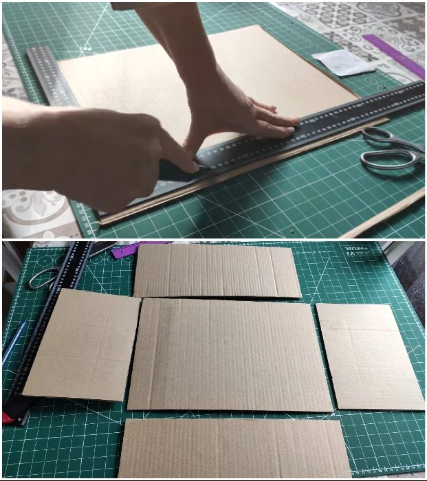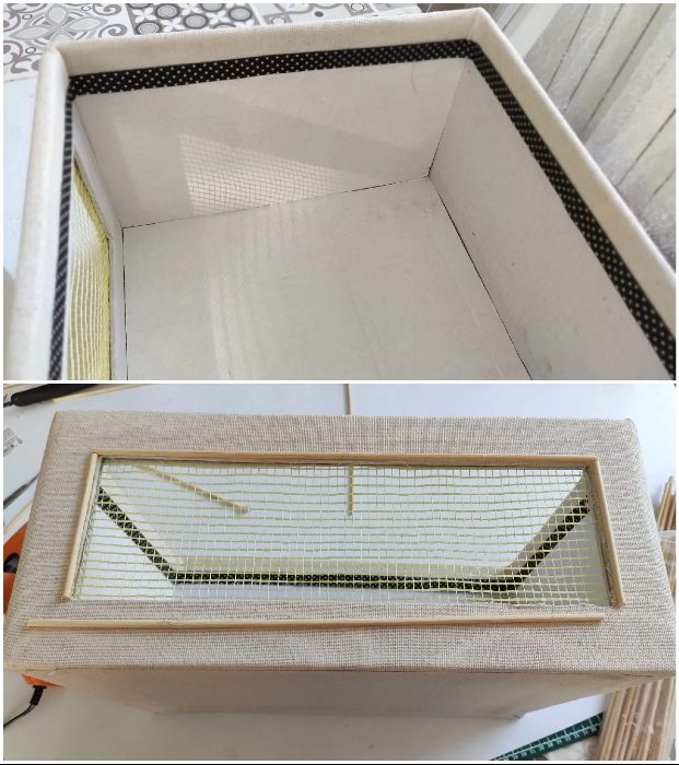 Это очень скрупулезная и длительная работа, но она стоит того, чтобы повозиться. Для начала нужно раскроить и вырезать все цельные детали ящиков (для плотности конструкции можно их сделать двойными). Затем можно приступать к созданию фасадных «планок» с окошком. Работа усложнится, ведь требуется вырезать одинаковое отверстие на двух половинках лицевой части, подвернуть картон и закрепить между ними кусок строительной сетки нужного цвета и размера. Это можно сделать с помощью клея ПВА.