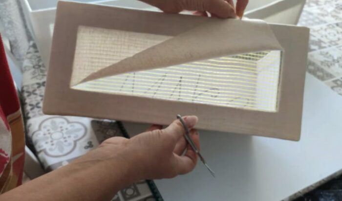 Так выглядят ящики после закрепления ткани и молдингов из деревянных шпажек.