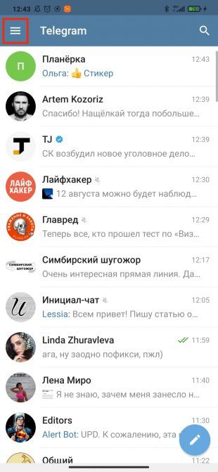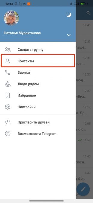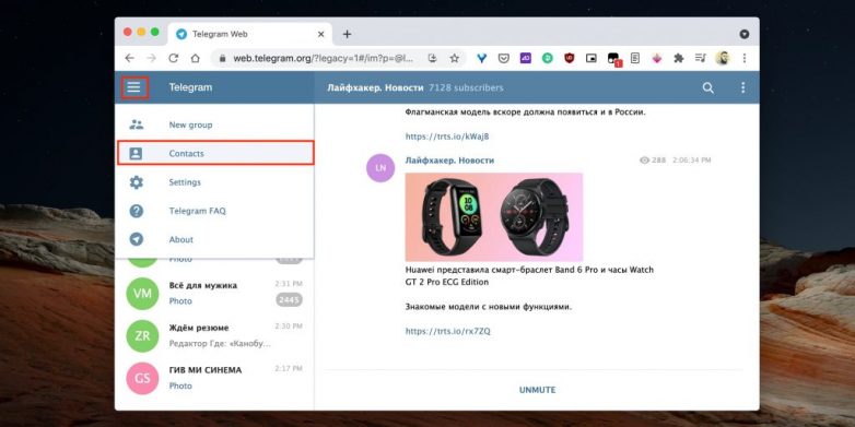 Откройте расширенное меню, нажав на кнопку с тремя полосками, и перейдите в пункт «Контакты».