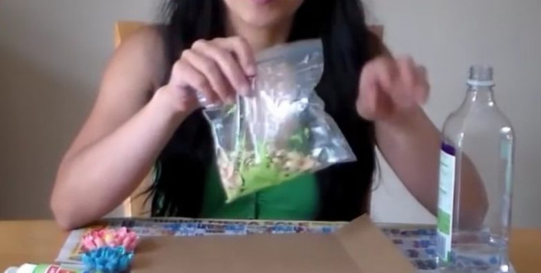 Насыпьте скорлупу от фисташек в пакет с застежкой. Добавьте несколько капель акриловой краски и одну столовую ложку воды.