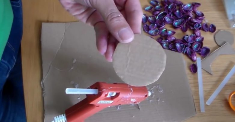 Теперь начинайте добавлять остальные скорлупки. По одной приклеивайте их к основанию цветка, до тех пор пока не дойдете до края картона.