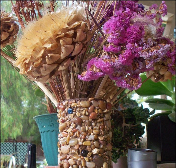 Может, кто из вас успел насобирать на море красивые камушки, морскую гальку? Подкидываю вам идею создания очень красивых цветочных ваз для украшения интерьера. А использовать мы будем ненужную тару — пластиковые и консервные банки. Посмотрите, какую красоту можно создать для осеннего декора!