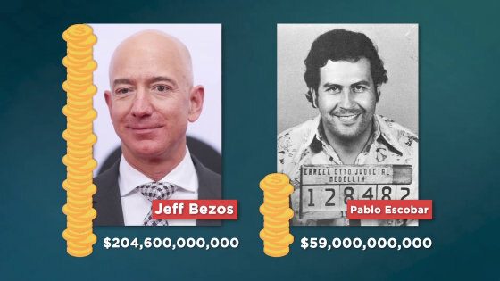 Видео ролик RealLifeLore начинается с сравнения накоплений наркобарона Пабло Эскобара у которого денег было так много, что ему приходилось их закапывать. Однако его «богатства» составляют менее трети по сравнению с банковским счетом Безоса.
