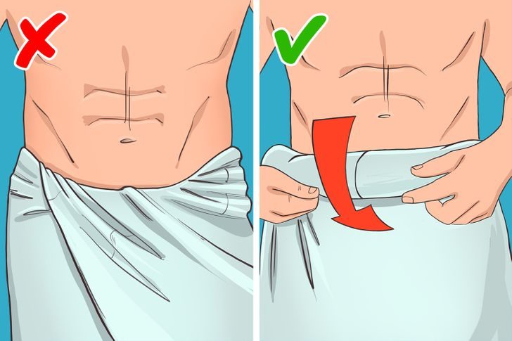 Полотенце будет держаться крепче, если не затыкать один угол за пояс, а завернуть наружу верхний край полотенца, когда вы его полностью обернете вокруг талии.