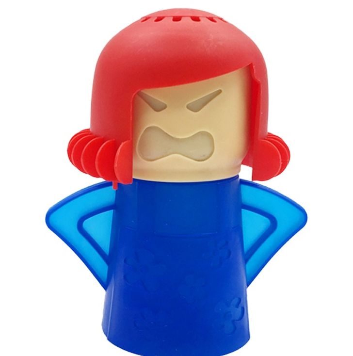 Вот эта недовольная дама может спасти положение: достаточно налить в нее уксуса с водой в пропорции 1:1, поставить ее в микроволновку и включить печь на несколько минут. Пары кислоты растворят жир, потом останется лишь слегка протереть поверхность тряпкой.