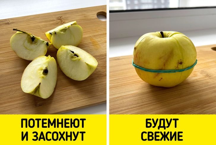 Если вы разрезали яблоко, но не смогли съесть все кусочки, можно обернутьих резинкой. Это защитит яблоко от потемнения