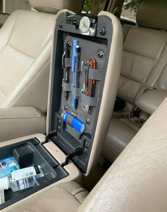 Достаточно несложно организовать при помощи двухстороннего скотча отличное место для хранения всего необходимого в автомобильном раскладывающемся подлокотнике.