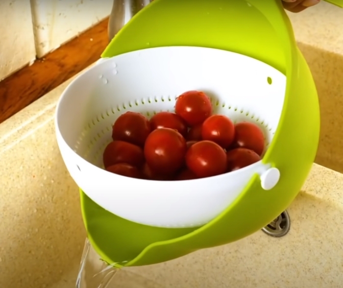 Данная тарелка состоит из двух частей: внешняя простая округлой формы, а внутренняя — меньшего диаметра с отверстиями для слива жидкости. В такой емкости удобно мыть овощи все сразу вместе, тогда наклонив ее можно слить лишнюю воду и приступать к готовке. Также в этой тарелке очень удобно хранить ягоды, также предварительно их помыв. Все продукты будут чистыми, но не будет необходимости с трудностями сливать воду: достаточно наклонить нижнюю часть и все выльется, но ягоды или овощи останутся на своих местах.